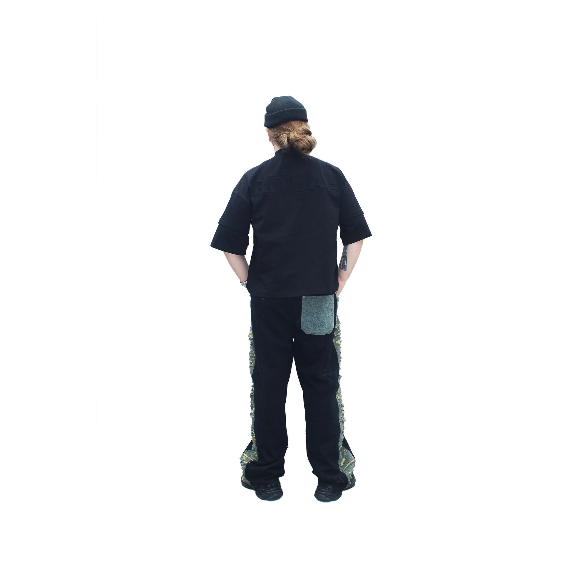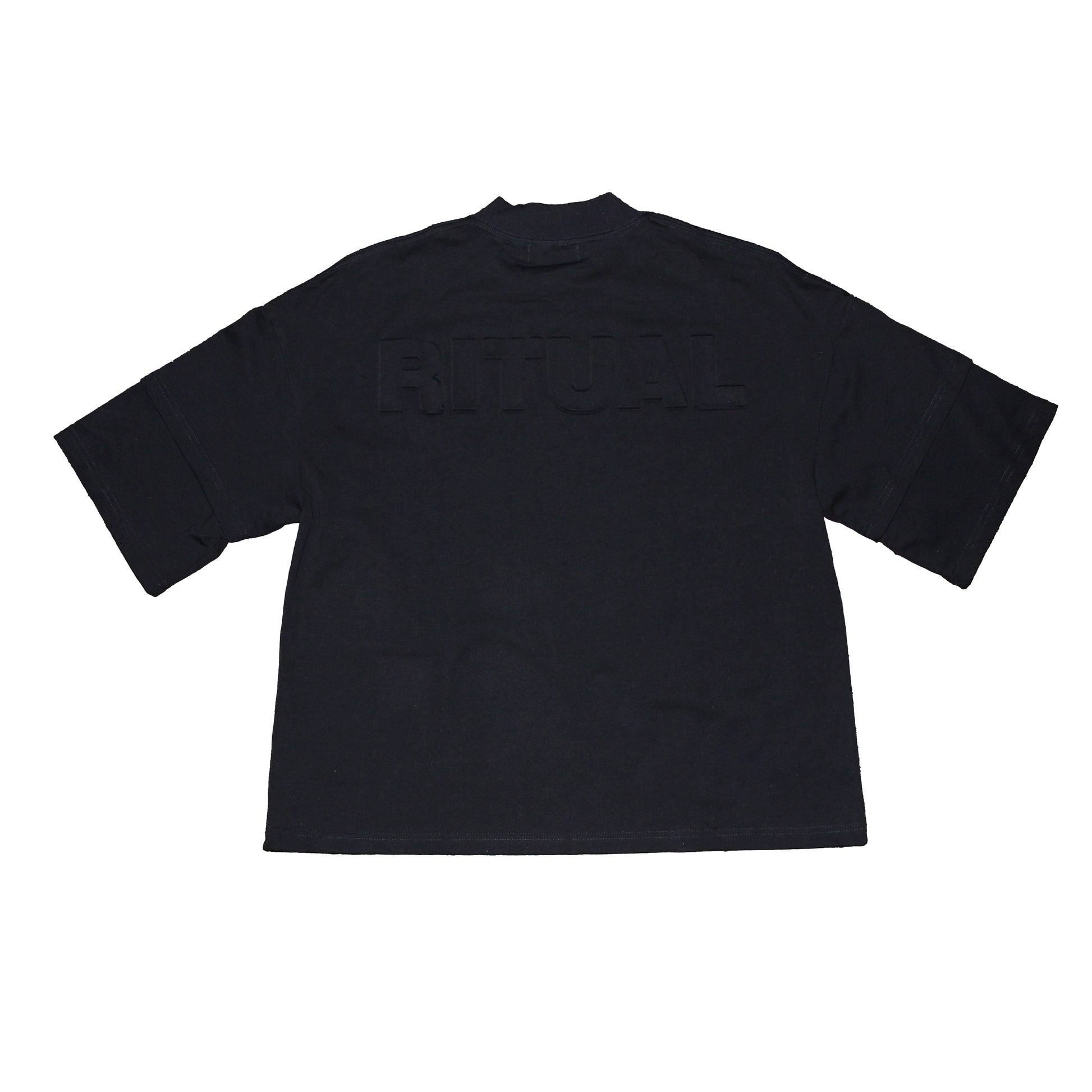 Crafted from heavyweight 300gsm natural cotton for durability and longevity. Designed with a cropped, boxy fit and double-layered sleeves sewn into the construction. The front features a DTG-printed globe surrounded by “ritual” written in twelve languages, while the back showcases a raised 3D embossed logo. Built to age well and last for years of wear.